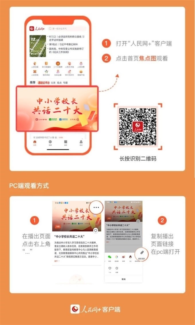 5月12日起,“人民網(wǎng)+”客戶(hù)端推出“中小學(xué)校長(zhǎng)共話(huà)二十大”專(zhuān)題節(jié)目,每日11:00上新,圍繞黨的領(lǐng)導(dǎo)、鑄魂育人、教育改革、教育公平、強(qiáng)師興校等話(huà)題述成績(jī)、言感悟、談現(xiàn)狀、話(huà)未來(lái),切實(shí)把黨的二十大精神轉(zhuǎn)化為辦學(xué)治校、教書(shū)育人的實(shí)際行動(dòng)。讓我們一起傾聽(tīng)全國(guó)百位中小學(xué)校長(zhǎng)共話(huà)二十大,共同描繪教育事業(yè)發(fā)展的新藍(lán)圖。