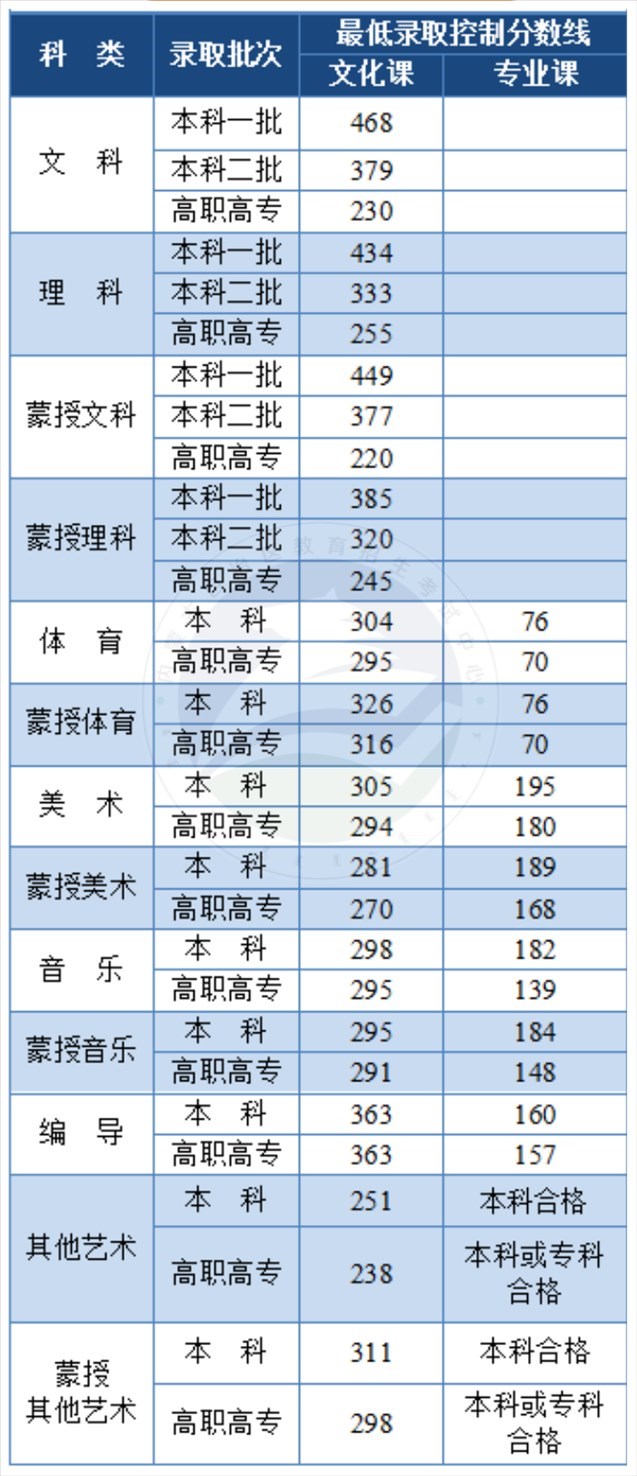 內(nèi)蒙古普通高考最低錄取控制分?jǐn)?shù)線