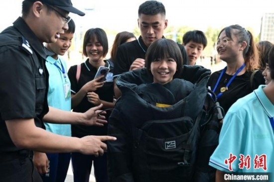 7月9日,隊員們觀看特警訓(xùn)練及警犬演示,現(xiàn)場體驗警械武器和警車等裝備使用,民警講解安全防范知識。