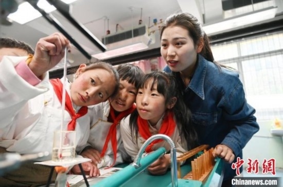 5月18日,四川阿壩州壤塘縣寄宿制學校學生在科學課做實驗。中新社記者 安源 攝