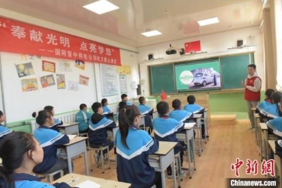 在國(guó)家電網(wǎng)“電力愛(ài)心教室”內(nèi),電力人員為鄉(xiāng)村兒童科普電力知識(shí)。展望攝