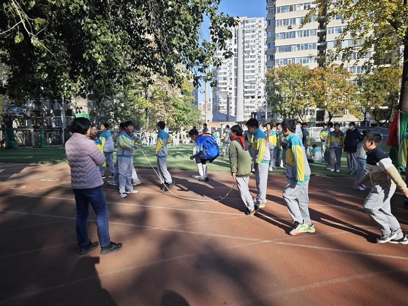 北醫(yī)附小學生課間在操場上跳長繩。