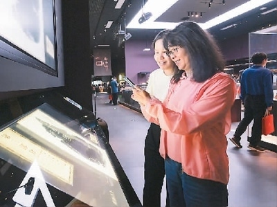 兩位觀眾在中國考古博物館內(nèi)的“甲骨互動體驗區(qū)”參與體驗活動。新華社記者 李 賀攝