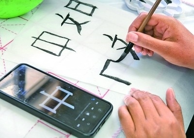 英國(guó)倫敦,一名學(xué)生在2023年“國(guó)際中文日”英國(guó)主題活動(dòng)上展示自己的書法。新華社發(fā)