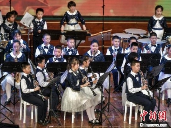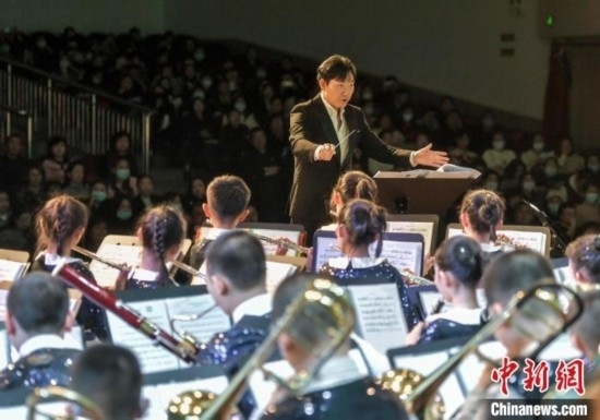 12月27日,新疆烏魯木齊市沙依巴克區(qū)教育系統(tǒng)“龍行龘龘 樂動童年”2024年交響管樂新年音樂會在該市青少年宮舉辦,來自烏魯木齊市第27小學(xué)的交響管樂團演奏了《紅旗頌》、《茉莉花》等經(jīng)典曲目,并與絲路名師合唱團合作演出《青春之舞》、《最炫民族風(fēng)》等曲目。據(jù)介紹,該交響管樂團成立于2014年,規(guī)模從最初的40余人發(fā)展到現(xiàn)今近70人,團員平均年齡10歲。