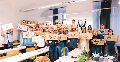 匈牙利羅蘭大學(xué)孔子學(xué)院下設(shè)埃格爾教學(xué)點多博·伊什特萬中學(xué)中文課堂的學(xué)生們展示繪畫作品。