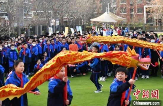 3月11日,學生們舞龍,感受傳統(tǒng)文化魅力。中新網(wǎng)記者 翟羽佳 攝