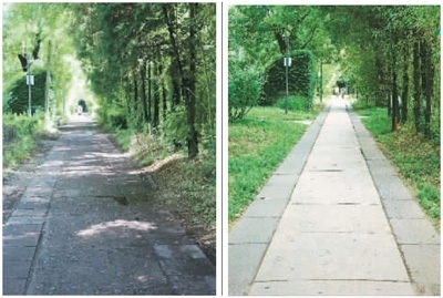 左圖:保護(hù)項(xiàng)目對(duì)燕南園水泥路修復(fù)前的景象。右圖:保護(hù)項(xiàng)目對(duì)燕南園水泥路進(jìn)行修復(fù)后的效果。燕南園保存下來(lái)的水泥路以“脫漿彩石混凝土”工藝進(jìn)行施工,老校友稱(chēng)之為“洋灰路”。這里的“洋灰路”已有76年歷史,大部分仍能正常使用。北大建筑與景觀設(shè)計(jì)學(xué)院的李迪華老師發(fā)現(xiàn),燕南園東側(cè)水泥路破損后,顯露出大小和顏色都參差不齊的石子。于是,他開(kāi)始追溯這些“洋灰路”的歷史價(jià)值,與北大“燕園公益營(yíng)建社”的黃可同學(xué)翻閱北大檔案館資料,找到了歷史照片。又幾經(jīng)輾轉(zhuǎn),尋訪到了九旬高齡的老校友。研究發(fā)現(xiàn),燕園中最早的水泥路修建于1948年。為此,李迪華大力呼吁保護(hù)這些水泥路,尋訪到專(zhuān)門(mén)修復(fù)歷史路面的施工團(tuán)隊(duì),對(duì)少量保存完整的路面進(jìn)行修復(fù);破損的洋灰原料則被回收,取出原骨料,采用相同的工藝進(jìn)行還原。不僅老材料得到循環(huán)利用,歷史道路的價(jià)值也“凝固”在更新后的路面中。