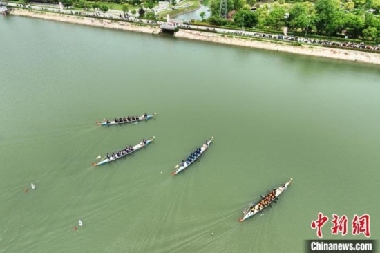 龍舟隊員們在湖面上競技。(無人機(jī)照片)陳家樂攝