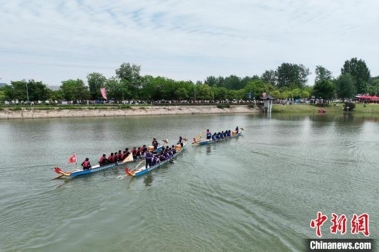 5月2日,來自長三角地區(qū)的12所高校的龍舟隊齊聚安徽肥西,展開了一場龍舟競技。(無人機(jī)照片)陳家樂攝