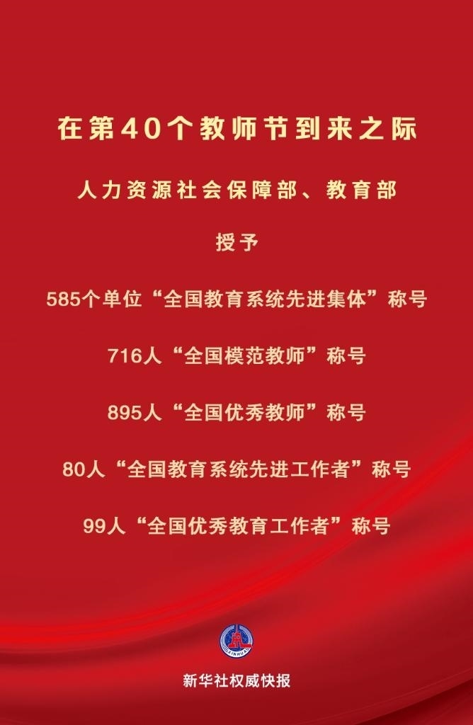 慶祝第40個(gè)教師節(jié)暨全國(guó)教育系統(tǒng)先進(jìn)集體和先進(jìn)個(gè)人表彰活動(dòng)9月8日在京舉行。