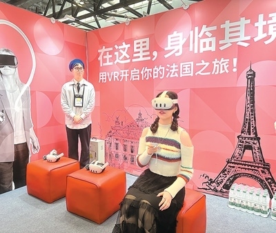 法國(guó)高校展區(qū)設(shè)立了VR體驗(yàn)項(xiàng)目,觀(guān)眾戴上眼鏡后可以看到埃菲爾鐵塔等地標(biāo)建筑。