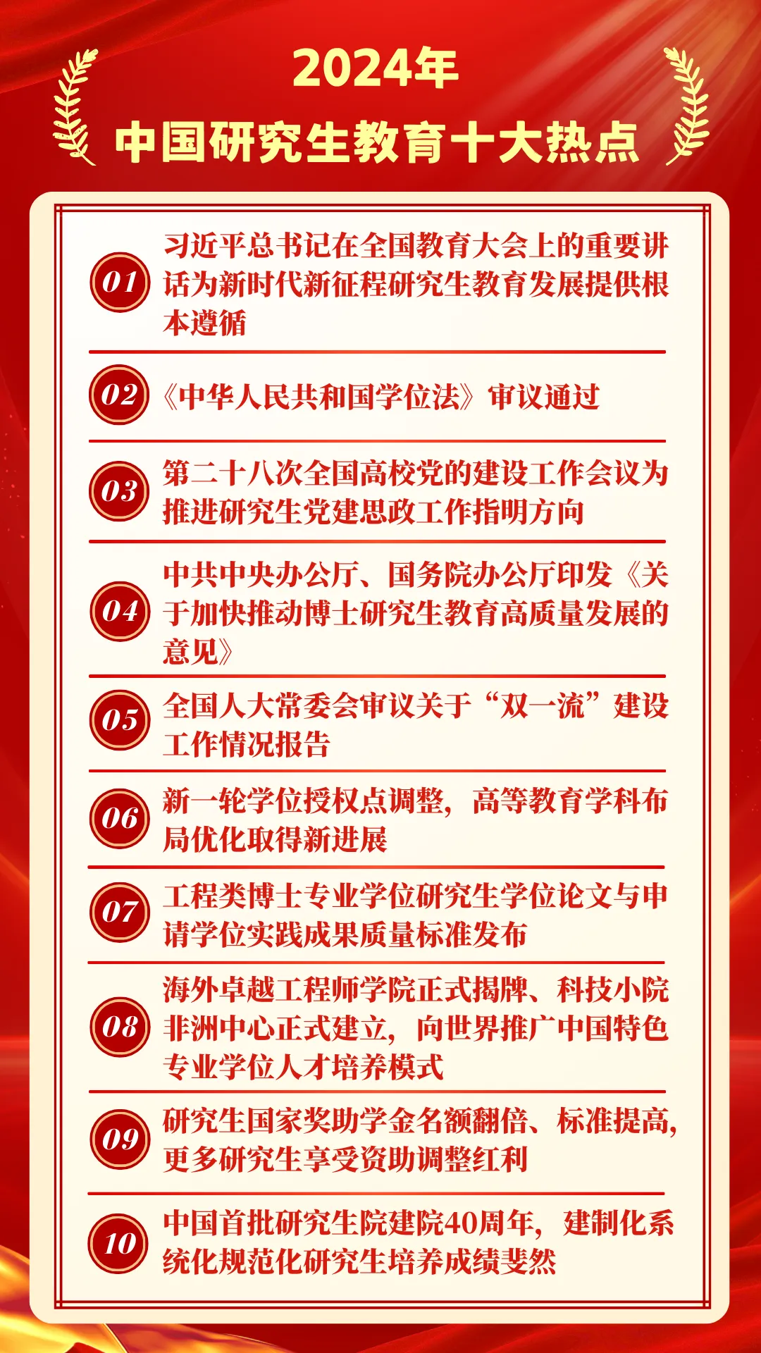 2024年,是中國(guó)學(xué)位與研究生教育發(fā)展史上具有重要里程碑意義的一年,在教育部學(xué)位管理與研究生教育司指導(dǎo)下,教育部學(xué)位與研究生教育發(fā)展中心《中國(guó)研究生》雜志回顧總結(jié)全年研究生教育大事要事和熱點(diǎn)動(dòng)態(tài),聯(lián)合人民網(wǎng)、新華網(wǎng)、中國(guó)教育報(bào)和有關(guān)研究生教育媒體等共同發(fā)布2024年中國(guó)研究生教育十大熱點(diǎn)。