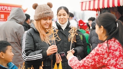 山東科技大學(xué)外國(guó)留學(xué)生在青島泊里大集上了解糖畫(huà)。