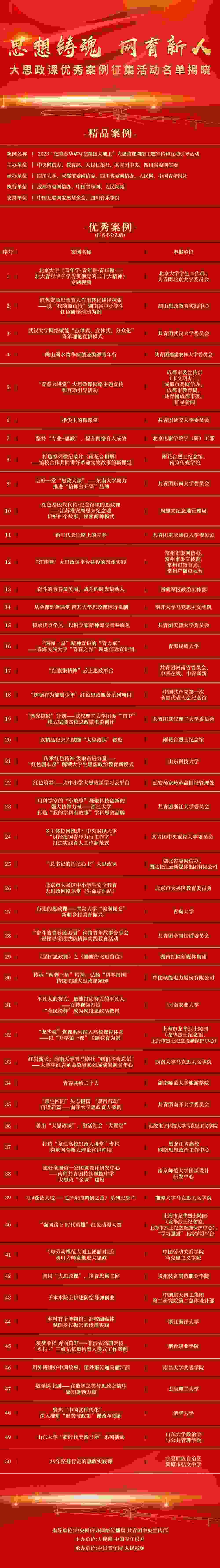 人民網(wǎng)北京2月10日電 (記者王鑫)由中央網(wǎng)信辦網(wǎng)絡(luò)傳播局、共青團(tuán)中央宣傳部指導(dǎo),人民網(wǎng)、中國(guó)青年報(bào)社共同主辦的“思想鑄魂 網(wǎng)育新人”大思政課優(yōu)秀案例征集活動(dòng)評(píng)選今天揭曉結(jié)果,經(jīng)初選、終選以及結(jié)果公示,產(chǎn)生精品案例1件、優(yōu)秀案例50件,名單如下: