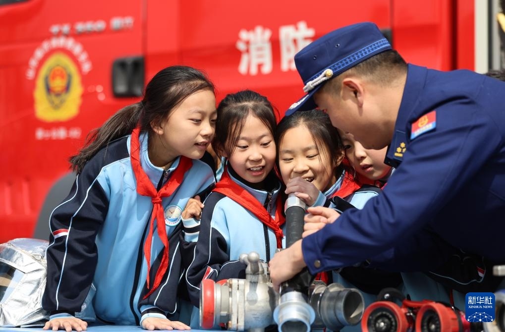 3月31日,在山東省臨沂市郯城縣第三實(shí)驗(yàn)小學(xué),消防救援人員為學(xué)生講解消防裝備器材。