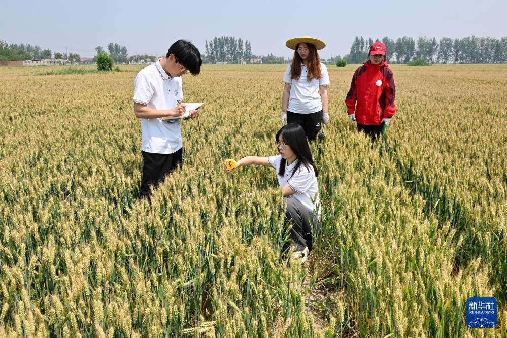 5月26日,河北省曲周縣傅莊科技小院的學生在麥田里測量植株高度。
