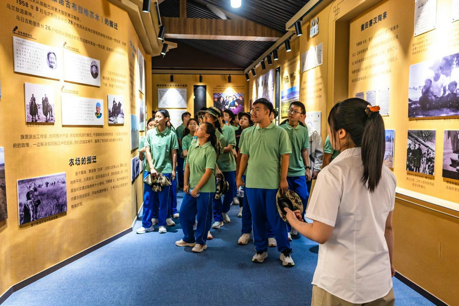 在寶日烏拉黨政機(jī)關(guān)舊址,同學(xué)們聆聽講解,了解“最好牧場(chǎng)為航天”的感人往事, 感受老一輩建設(shè)者們?cè)陲L(fēng)沙中對(duì)祖國的赤誠。烏海市第十中學(xué)胡林濤說:“聽了‘最好牧場(chǎng)為航天’的故事,我真正懂得了什么是舍小家為國家。他們帶著牲畜離開世代生活的牧場(chǎng),沒有一句抱怨,眼里只有對(duì)國家的支持,這種家國情懷太打動(dòng)人了,以后我也要把這份擔(dān)當(dāng)記在心里,努力成為對(duì)國家有用的人。”