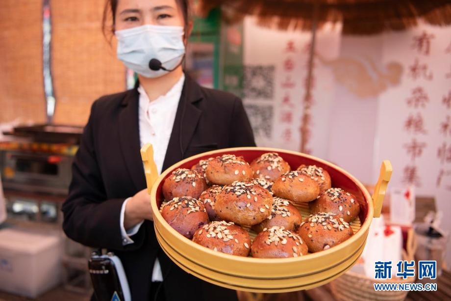 9月22日,在位于山西省忻州市忻府區(qū)小檀村的雜糧美食節(jié)現(xiàn)場(chǎng),工作人員展示一款雜糧面包。新華社記者 楊晨光 攝