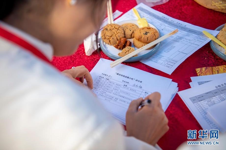 9月22日,在位于山西省忻州市忻府區(qū)小檀村的雜糧美食節(jié)現(xiàn)場(chǎng),評(píng)委在為食品打分。新華社記者 楊晨光 攝