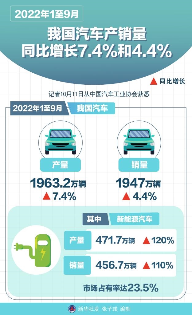 記者11日從中國(guó)汽車工業(yè)協(xié)會(huì)獲悉,今年1至9月,我國(guó)汽車產(chǎn)銷量分別達(dá)1963.2萬(wàn)輛和1947萬(wàn)輛,同比增長(zhǎng)7.4%和4.4%。其中,新能源汽車產(chǎn)銷量分別達(dá)471.7萬(wàn)輛和456.7萬(wàn)輛,同比增長(zhǎng)120%和110%,市場(chǎng)占有率達(dá)23.5%。