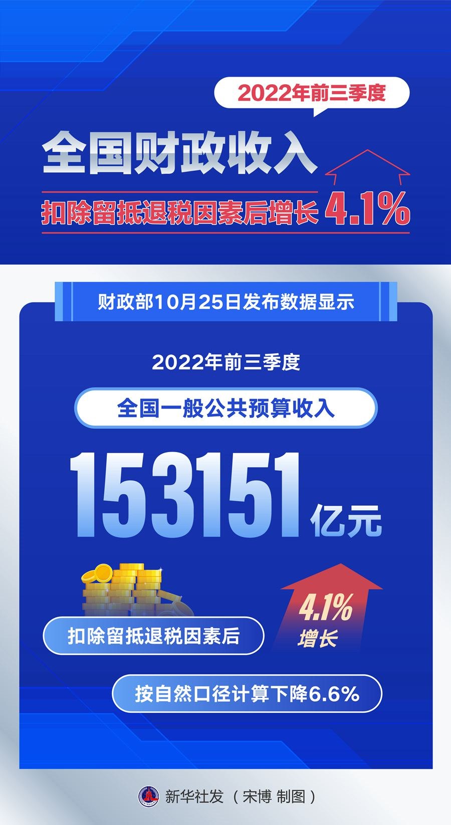 財政部25日發(fā)布數(shù)據(jù)顯示,今年前三季度,全國一般公共預算收入153151億元,扣除留抵退稅因素后增長4.1%,按自然口徑計算下降6.6%。