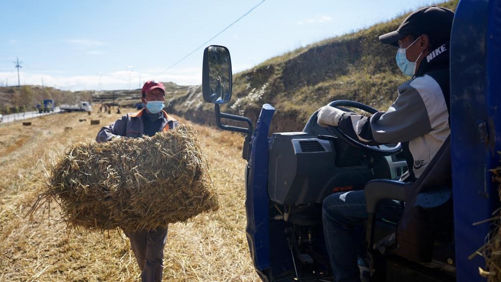 10月19日,日秀瑪村村民將剛打捆好的飼草裝車(chē)。新華社記者 陳杰 攝