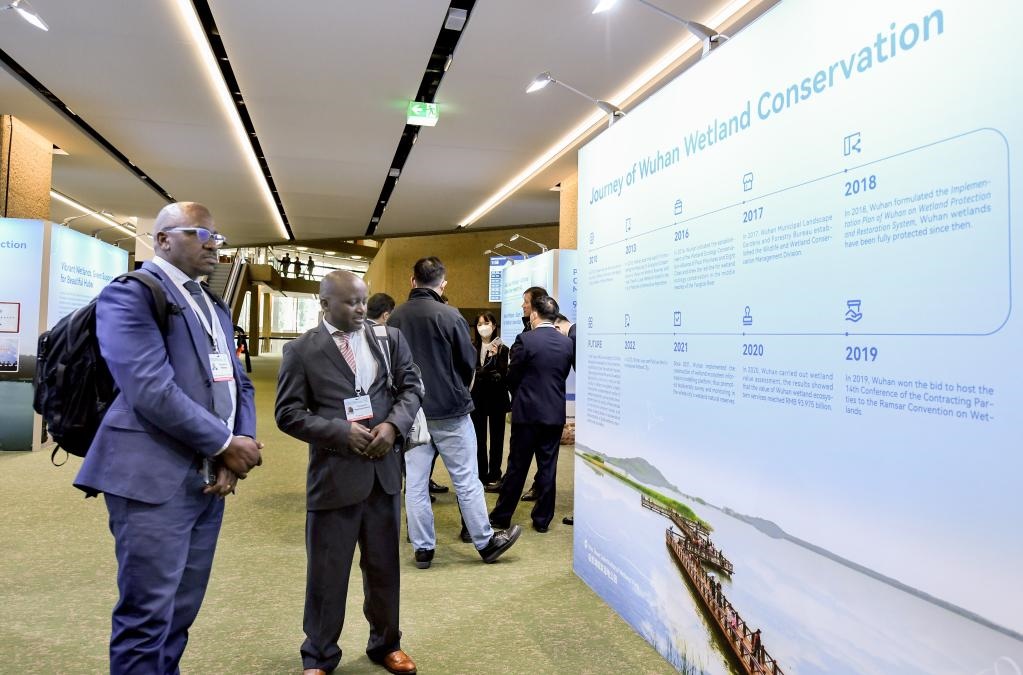2022年11月5日,在瑞士日內瓦,與會嘉賓在《濕地公約》第十四屆締約方大會日內瓦會場中國展區(qū)參觀。新華社記者連漪攝