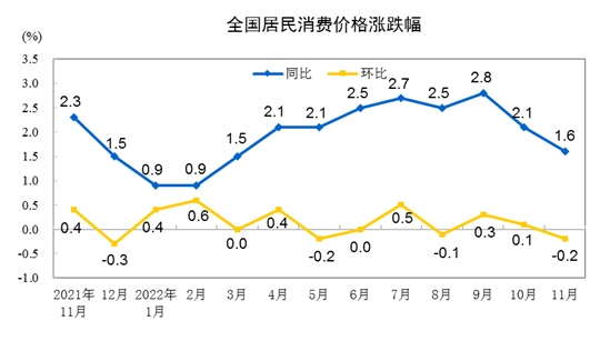 國(guó)家統(tǒng)計(jì)局今日發(fā)布數(shù)據(jù)顯示,2022年11月份,全國(guó)居民消費(fèi)價(jià)格同比上漲1.6%。其中,城市上漲1.5%,農(nóng)村上漲1.7%;食品價(jià)格上漲3.7%,非食品價(jià)格上漲1.1%;消費(fèi)品價(jià)格上漲2.3%,服務(wù)價(jià)格上漲0.5%。1-11月平均,全國(guó)居民消費(fèi)價(jià)格比上年同期上漲2.0%。