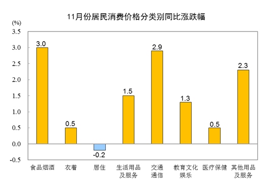 11月份,全國(guó)居民消費(fèi)價(jià)格環(huán)比下降0.2%。其中,城市下降0.2%,農(nóng)村下降0.2%;食品價(jià)格下降0.8%,非食品價(jià)格持平;消費(fèi)品價(jià)格下降0.1%,服務(wù)價(jià)格下降0.2%。