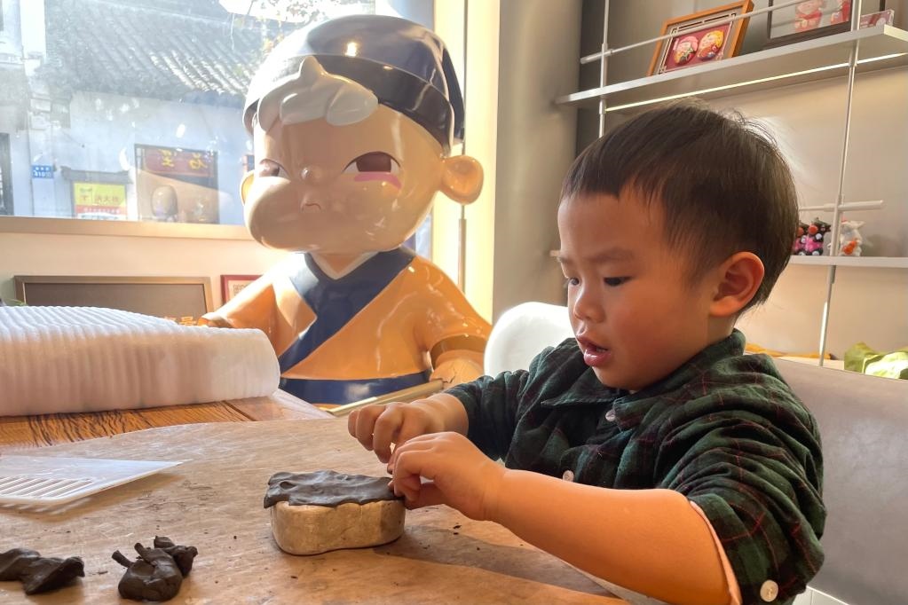 一名兒童在家長陪同下在泥人咖啡館捏泥人。新華社記者 朱國亮 攝