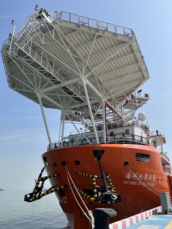 碼頭啟用當(dāng)日,“海洋地質(zhì)二號(hào)”多功能新型科考船也正式入列中國(guó)地質(zhì)調(diào)查局廣州海洋地質(zhì)調(diào)查局。廣州海洋地質(zhì)調(diào)查局海洋地質(zhì)二號(hào)船長(zhǎng)黃棉煜介紹,“海洋地質(zhì)二號(hào)”總長(zhǎng)85米,型寬22米,型深8米,排水量7224噸,航速12.5節(jié),可載員150人,自持力35天,續(xù)航力12000海里,配備了150噸主動(dòng)深沉補(bǔ)償海工吊、A型架、萬(wàn)米光纖絞車和地質(zhì)絞車、海上水文環(huán)境測(cè)量等調(diào)查設(shè)備。