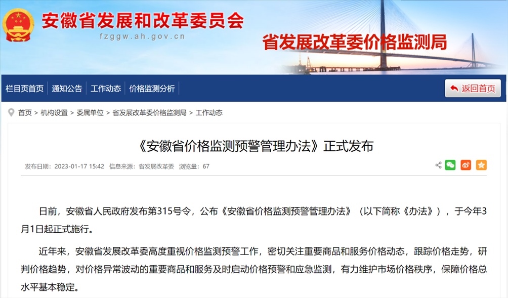 《安徽省價(jià)格監(jiān)測(cè)預(yù)警管理辦法》。圖片來源:安徽省發(fā)展和改革委員會(huì)