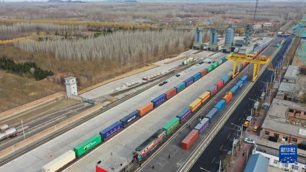 3月16日,在平谷地方鐵路馬坊站,京平綜合物流樞紐中歐班列(北京-莫斯科)停靠在站臺(無人機照片)。新華社發(fā)
