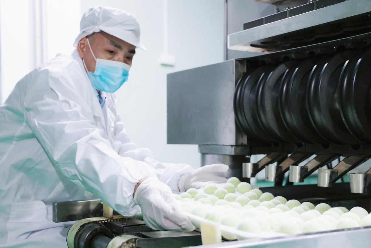一大早,位于江蘇省無錫市濱湖區(qū)胡埭鎮(zhèn)的食品生產(chǎn)車間,4臺(tái)大型和面機(jī)不停運(yùn)轉(zhuǎn),工人們忙著制作的正是當(dāng)?shù)氐奶厣鄨F(tuán)。