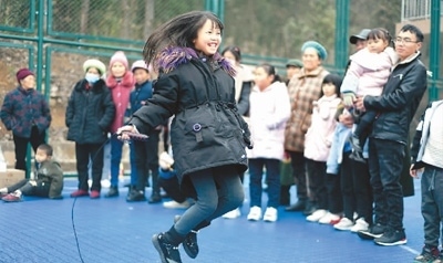 貴州省黔西南布依族苗族自治州安龍縣易地扶貧搬遷安置點(diǎn)春潭街道蘑菇小鎮(zhèn)新市民居住區(qū)舉辦趣味體育運(yùn)動(dòng)會(huì),轄區(qū)居民進(jìn)行了跳繩、拔河比賽等趣味項(xiàng)目,體驗(yàn)運(yùn)動(dòng)的快樂。圖為小朋友正在參加跳繩比賽。劉朝富攝(人民視覺)