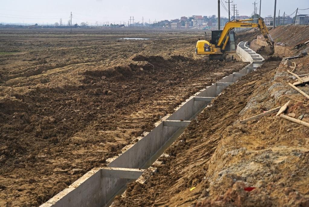 2月21日,施工人員在江西省南昌市新建區(qū)象山鎮(zhèn)高標田建設現(xiàn)場加固灌溉渠。新華社記者 萬象 攝