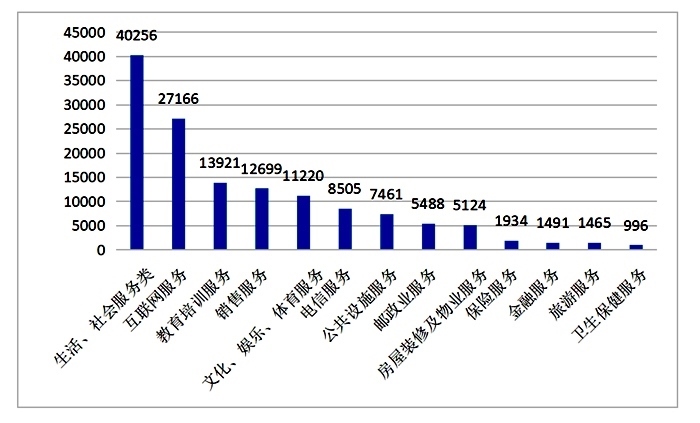 從商品和服務(wù)類別來看,在所有投訴中,商品類投訴為159143件,占總投訴量的52.32%,與去年同期相比,比重上升0.29個百分點;服務(wù)類投訴為137726件,占總投訴量的45.28%,比重上升0.87個百分點;其他類投訴為7290件,占總投訴數(shù)量的2.40%。