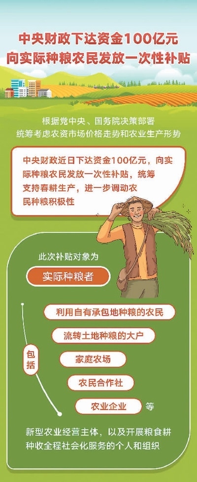 為此,國家統(tǒng)籌考慮農(nóng)資市場價格走勢和農(nóng)業(yè)生產(chǎn)形勢,中央財政向?qū)嶋H種糧農(nóng)民發(fā)放一次性補貼100億元,以穩(wěn)定農(nóng)民收入、保護(hù)農(nóng)民種糧積極性。