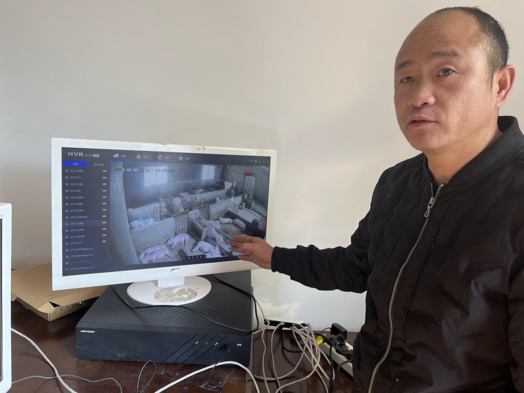 圖為2023年2月1日拍攝的何西康通過線上視頻監(jiān)控平臺(tái)查看豬崽生長情況。新華社記者 李驚亞 攝