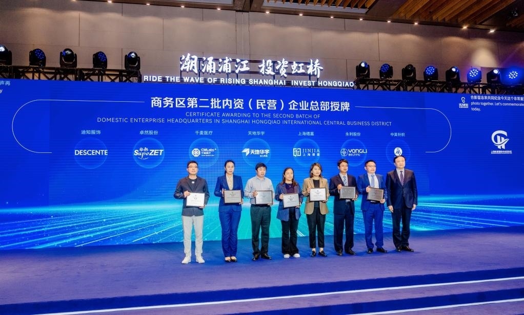 5月25日,“潮涌浦江·投資虹橋”2023虹橋國際中央商務(wù)區(qū)投資促進(jìn)大會(huì)現(xiàn)場(chǎng),7家新認(rèn)定的內(nèi)資(民營)企業(yè)總部集體授牌。新華社記者周蕊 攝