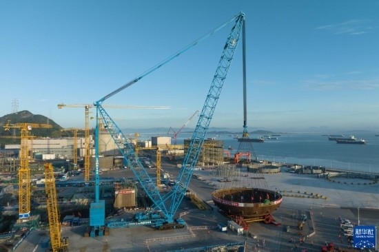這是5月29日拍攝的三門核電二期工程4號機組核島鋼制安全殼底封頭吊裝現(xiàn)場(無人機照片)。