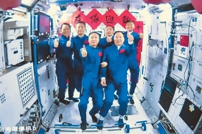 神舟十五號(hào)航天員乘組與神舟十六號(hào)航天員乘組拍下“全家?!?。