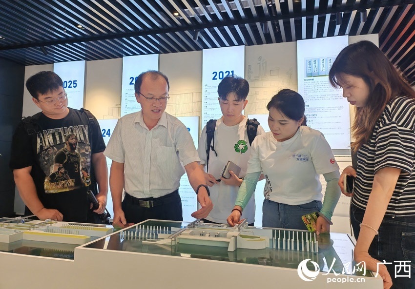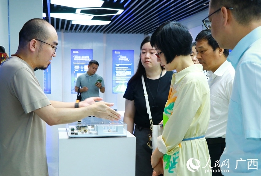 采訪團(tuán)在西部陸海新通道南寧國(guó)際鐵路港展廳內(nèi)采訪。人民網(wǎng) 嚴(yán)立政攝