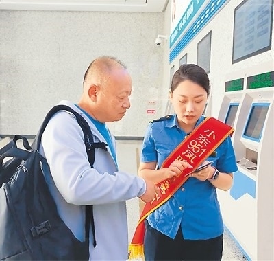 遼寧朝陽“小東951·鳳鳴朝陽”服務(wù)團隊成員幫助旅客使用手機12306APP購票。沈陽局供圖
