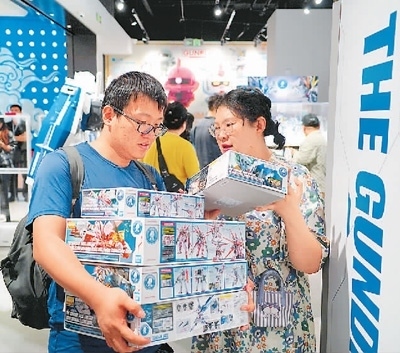 5月17日,北京高達基地旗艦店在王府井銀泰in88開業(yè),現場成品高達模型吸引不少市民參觀。圖為消費者正在選購。宋家儒攝(人民圖片)