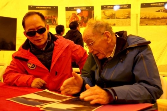 湯普森(右)、姚檀棟(左)在察看普若崗日冰原6號冰川冰穹A作業(yè)點返回營地后討論冰芯鉆取情況。新華社記者劉詩平 攝