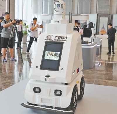在2024蘇州國(guó)際科創(chuàng)大會(huì)場(chǎng)外,廣目科技展出的新款無人安防巡邏車。