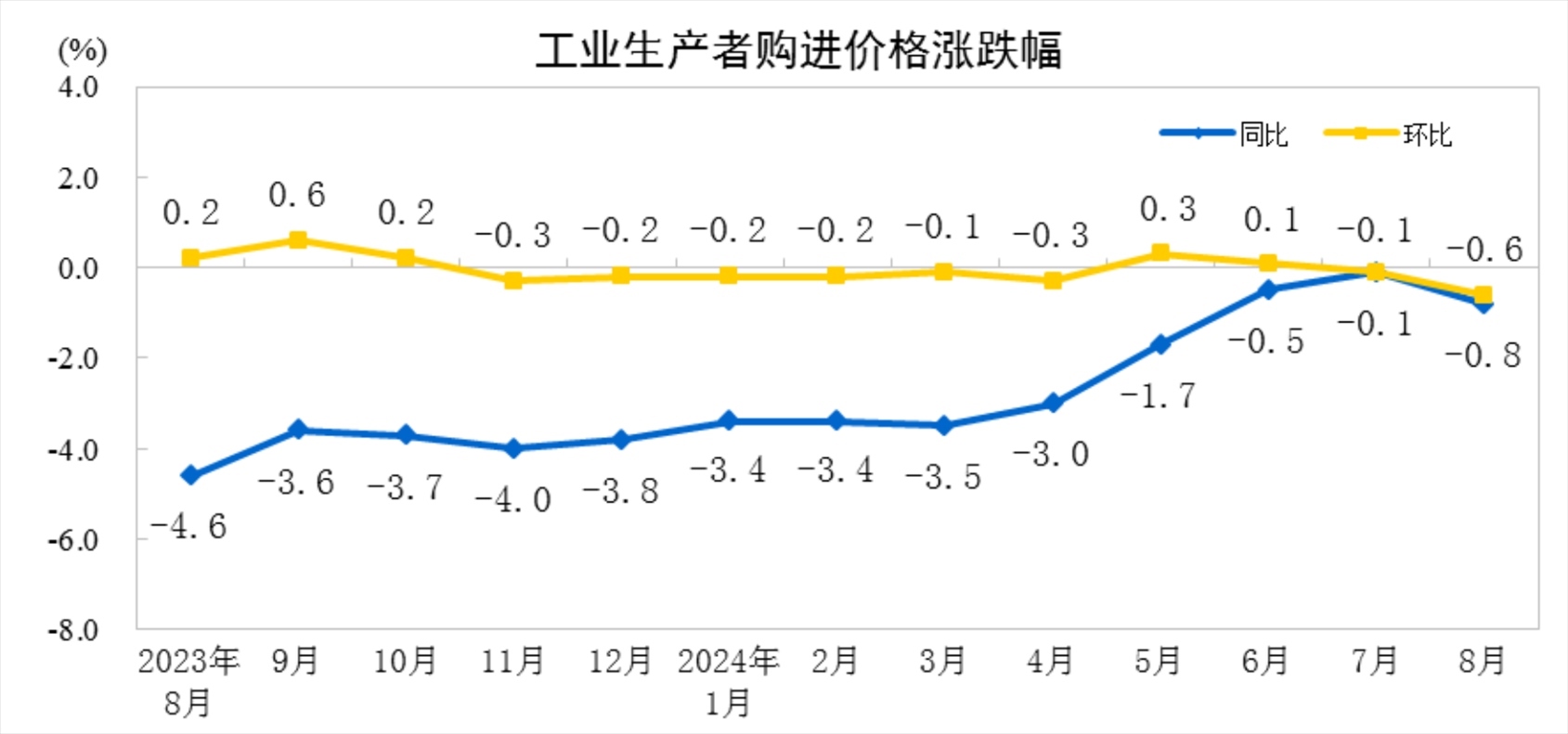 2024年8月份,全國(guó)工業(yè)生產(chǎn)者出廠價(jià)格同比下降1.8%,環(huán)比下降0.7%;工業(yè)生產(chǎn)者購(gòu)進(jìn)價(jià)格同比下降0.8%,環(huán)比下降0.6%。1—8月平均,工業(yè)生產(chǎn)者出廠價(jià)格比上年同期下降1.9%,工業(yè)生產(chǎn)者購(gòu)進(jìn)價(jià)格下降2.1%。