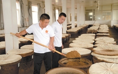 一旁,28歲的學(xué)徒李君正把缸里的醋醅翻到另一個(gè)醋缸之中。這是為了降溫而進(jìn)行的“打平翻缸”操作,要持續(xù)15天時(shí)間。“宋師傅說,發(fā)酵環(huán)節(jié)最難掌握的就是溫度的控制和時(shí)機(jī)?!币郧胺N地為生的李君,已經(jīng)跟著宋俊鵬學(xué)了5年釀醋,一個(gè)月有將近4000元的收入,“學(xué)會(huì)獨(dú)門技藝,咱也是手藝人了!”